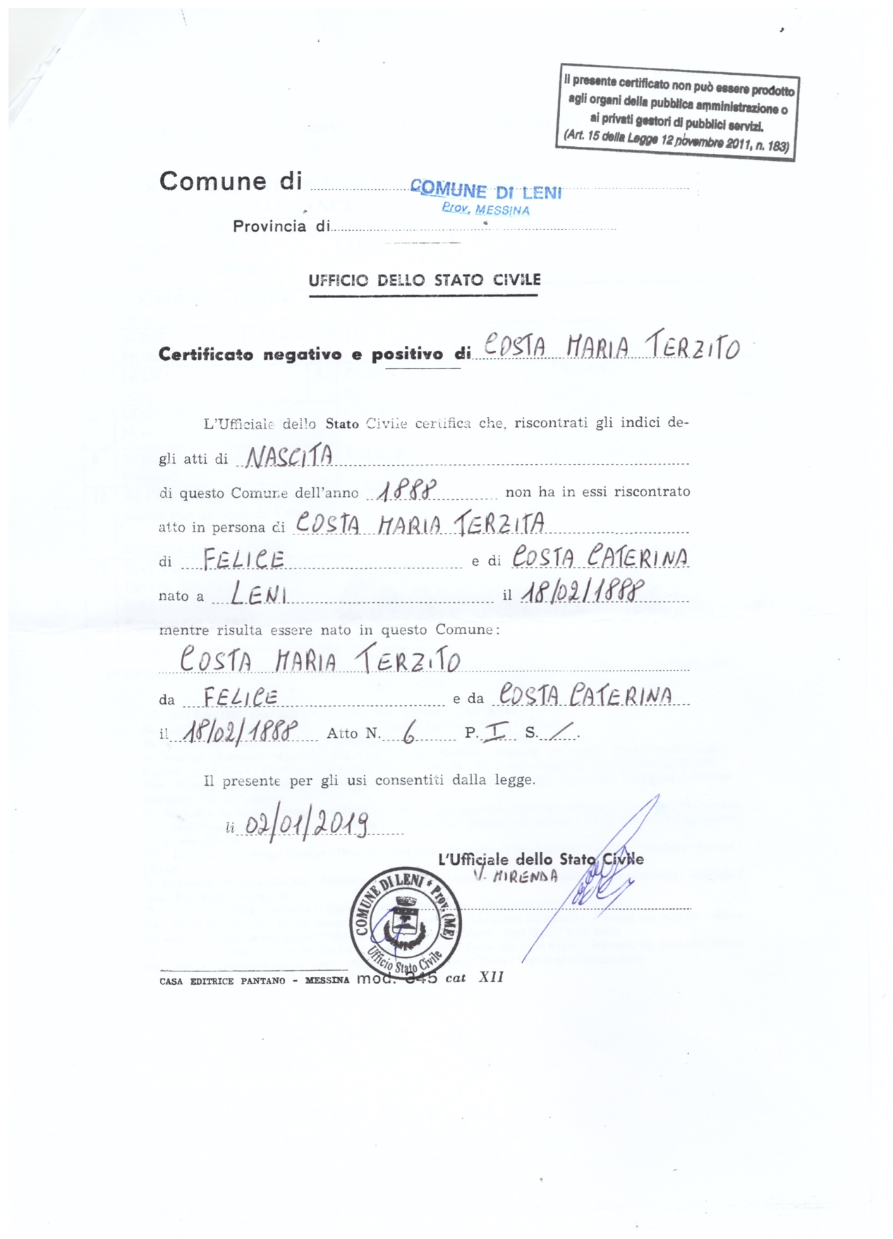 L’Ufficiale dello Stato Civilie ceriifica che, riscontrati gli indici deglia atti di Nascita di questo Comune dell’anno 1888 non ha in essi riscontrato atto in persona ci COSTA MARIA TERZITA di Felice e di COSTA CATERINA nato a Leni il 18/02/1888 mentre risulta essere nato in questo Comune: